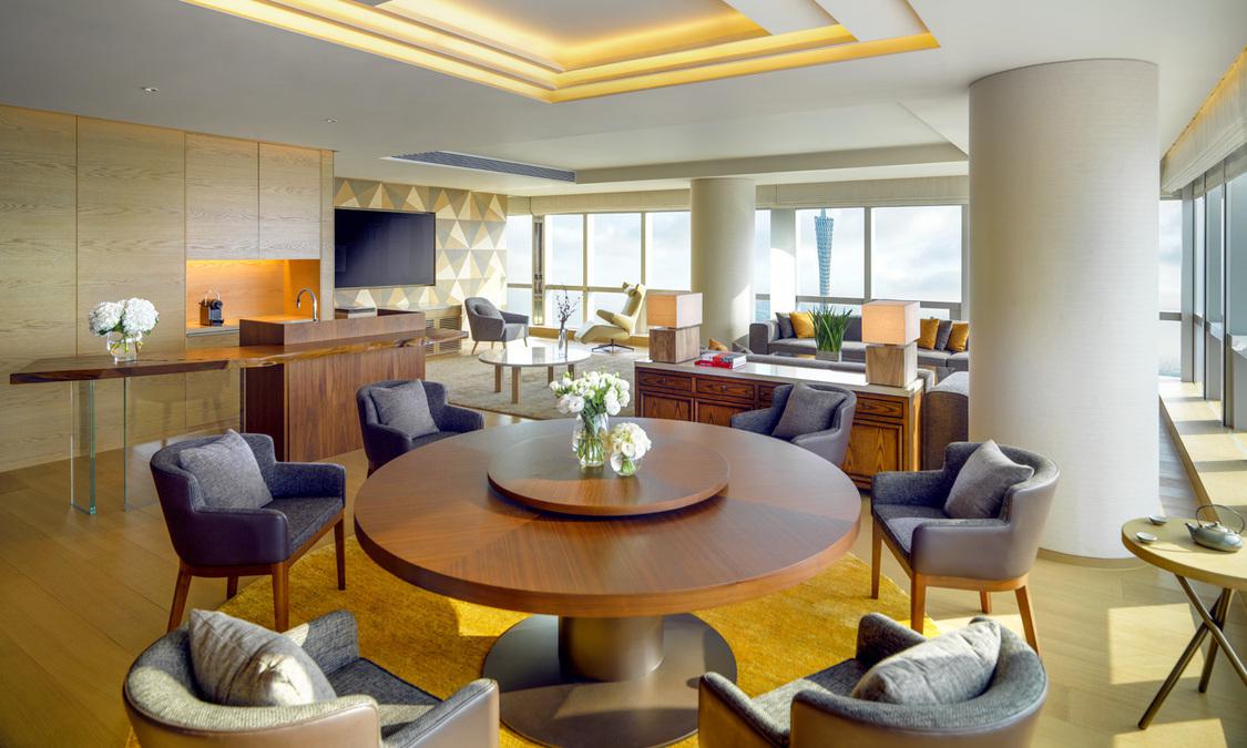 酒店拥有广州最高的会议室,位于66层。会议室内开放式厨房、休闲区域及全景落地窗带来360度城市环绕美景。