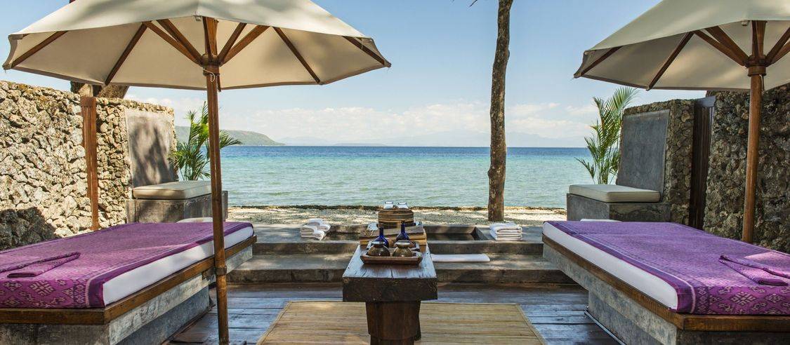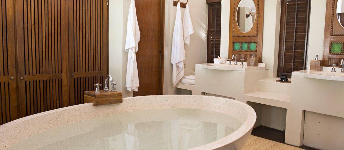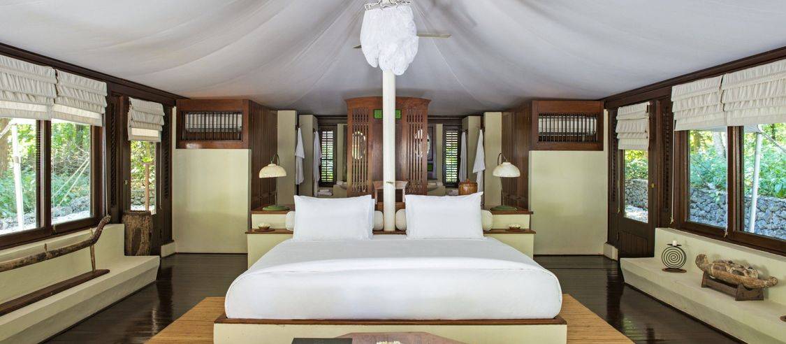 海边餐厅旁有一圈石堤,都是用粗砾的石块砌成,而度假村内的小径都是蜿蜒在草地上的细沙路。在码头边,有一个为客人海里浮潜上来冲淡水的地方,看上去只是一个三米不到的小山崖,机关就在旁边,扭动一个石块后,淡水从山崖的草丛中流出,形成一个马尾瀑布,非常有趣的设计。还有,被称为“Jungle Cave”的SPA,也是在海边的树丛中,就是简简单单由石墙围成几个没有顶的空间,按摩床面向大海,在这里做SPA也许能够真正体会到什么叫天人合一。住安缦瓦那的帐篷绝对不是苦兮兮的野外扎营,面积近60平方米的房间主体为木制结构,地板也是实木的,朝着大海的三面都是拥有大片玻璃的窗户,保证了空气流通,客人即使在房间里也能和户外的大自然没有距离!