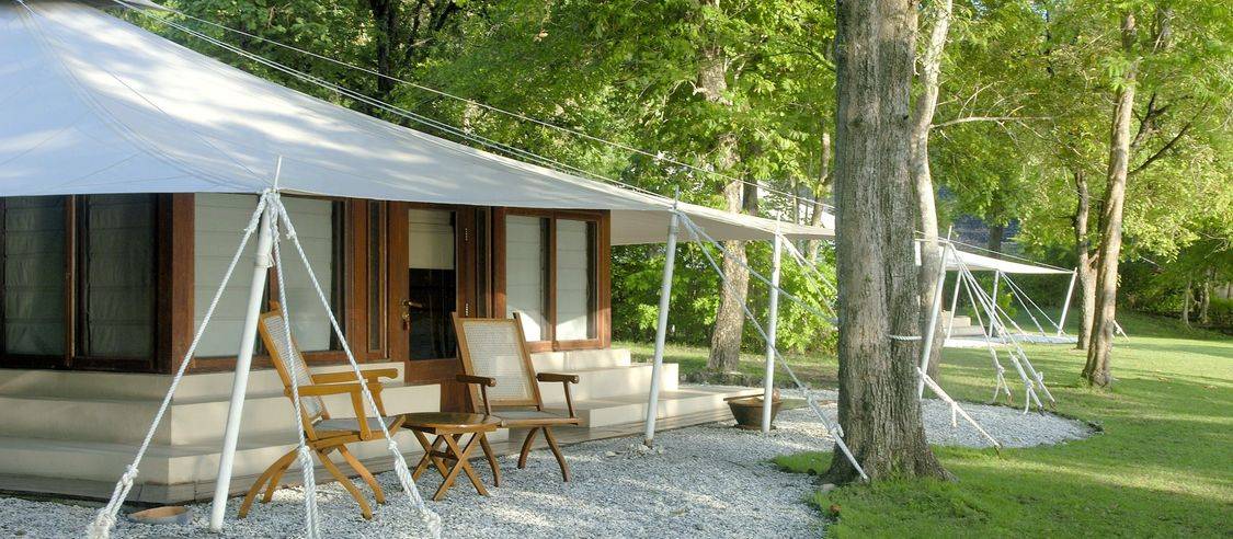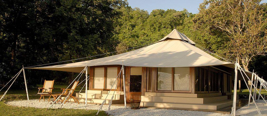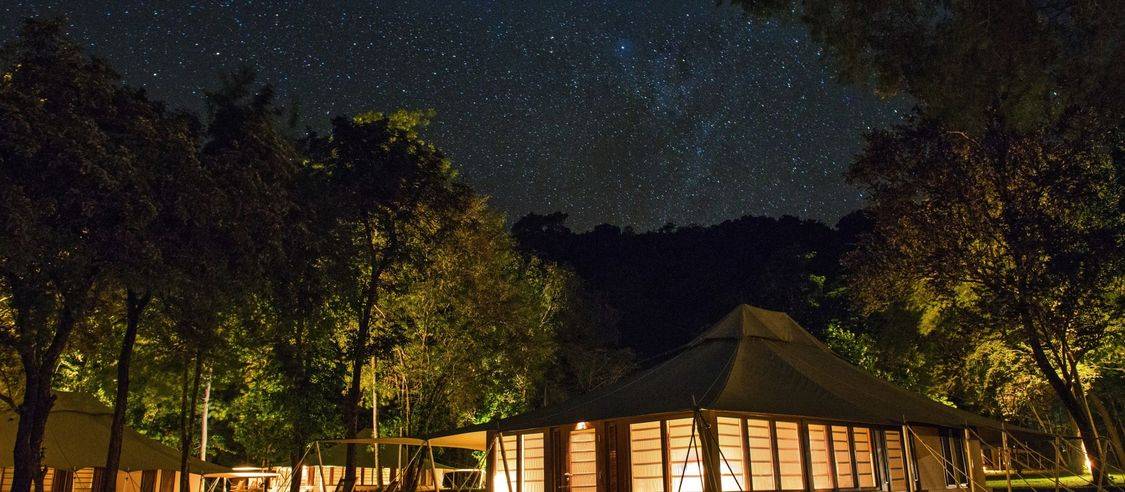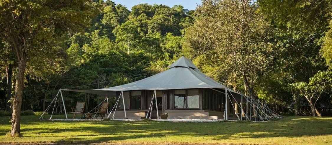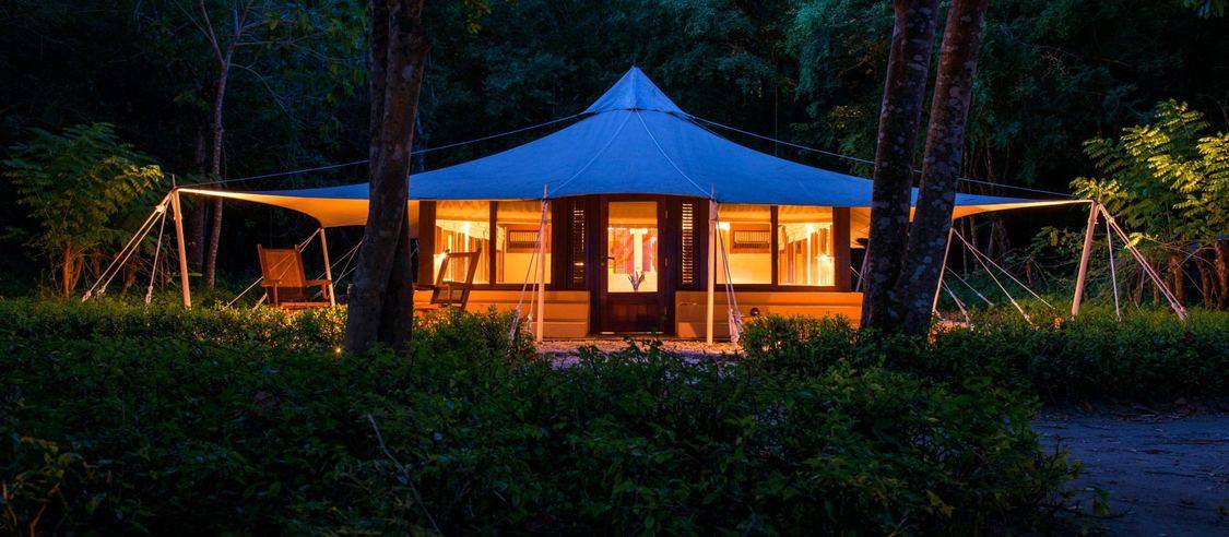 这个帐篷天幕式的房间,在夜里总能感受到室外自然的声音,连树叶落在篷顶上都可以清楚听到,听它坠落后沿着斜面慢慢落下,有一种睡在大自然之下的感觉。