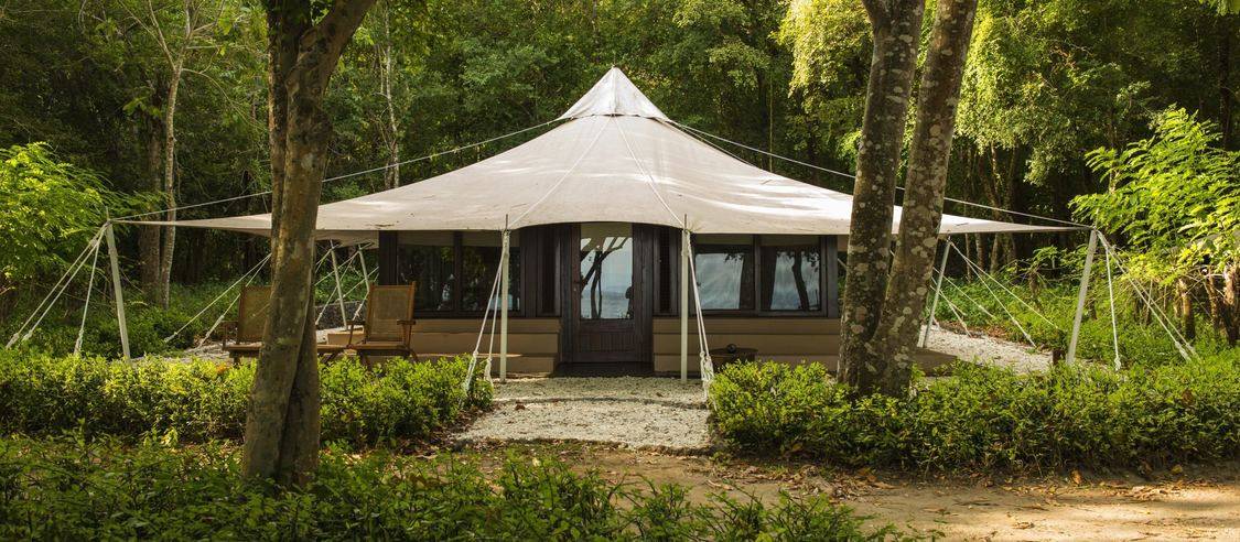 酒店的每一间villa外观虽是顶巨大的四方帐篷,但基础结构是稳固的水泥墙。房间有着光亮的硬木地板,屋顶由厚实的防水织物笼罩,四周环绕着木框观景窗,抬眼即能看见窗外的青葱绿意和摄人心魄的海景。卫浴空间很大,包括一个淋浴房和一座豪华的双槽洗面台。帐篷内的家具简单实用,夫妻有自己各自的大衣柜和步入式更衣室。在临窗的转角,还安放着一张白色卧榻;每天早起坐在这儿,呼吸清晨的空气、看跑来跑去的猴子、眺望蔚蓝的大海,就这么等待着身体与心灵慢慢苏醒。