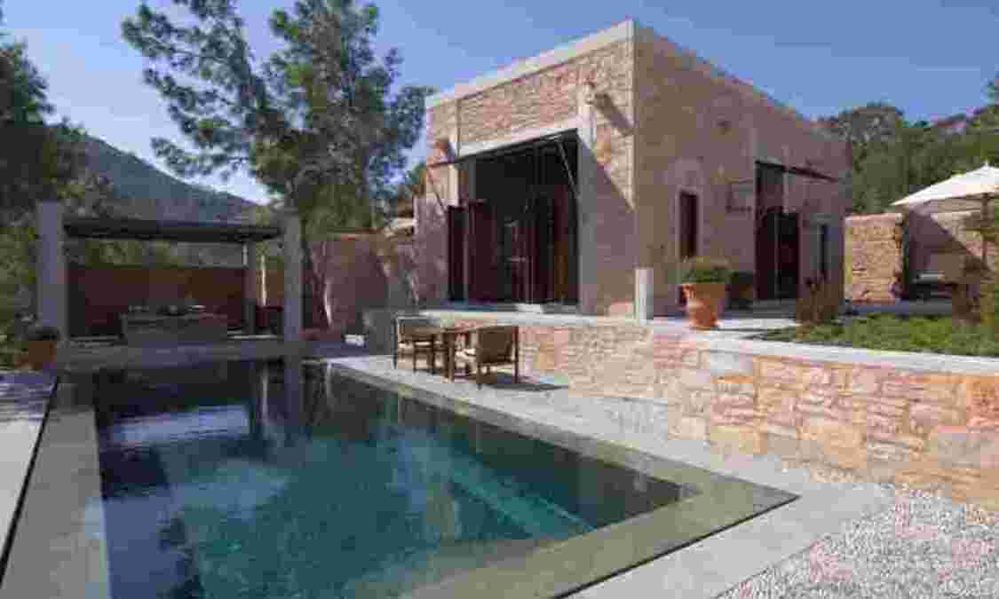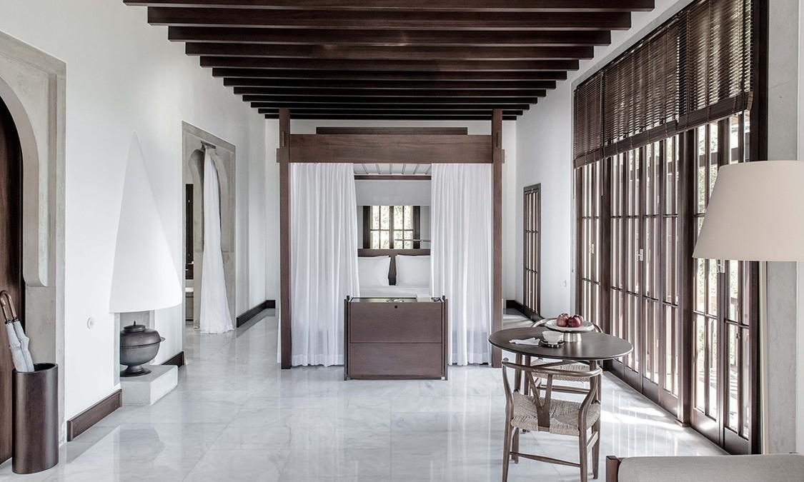 受当地传统建筑结构和建造风格影响,安缦如雅提供各式庭院房和露台房,这种空间感和奢华感营造出私密的个人空间。酒店内部的设计风格中融入了地中海元素和土耳其元素,围墙是用当地的石块砌成,家具、门窗是用深色的原木打造而成,地板是由土耳其大理石镶嵌而成,墙面的装饰是由石头手刻而成,充分尊重了周围的原始自然环境。